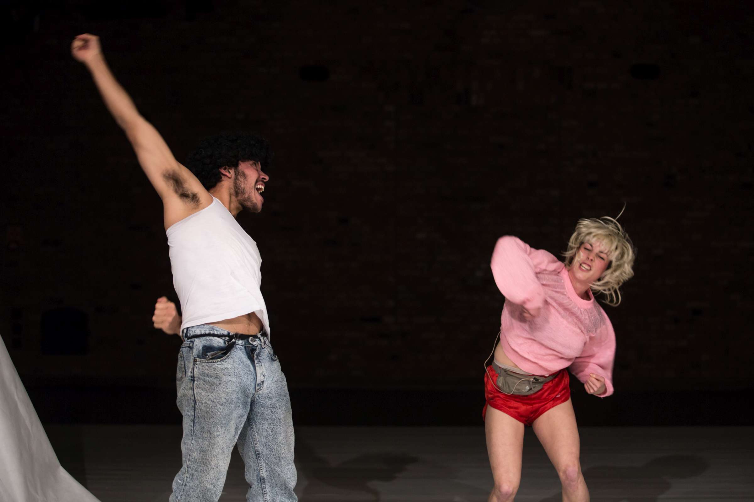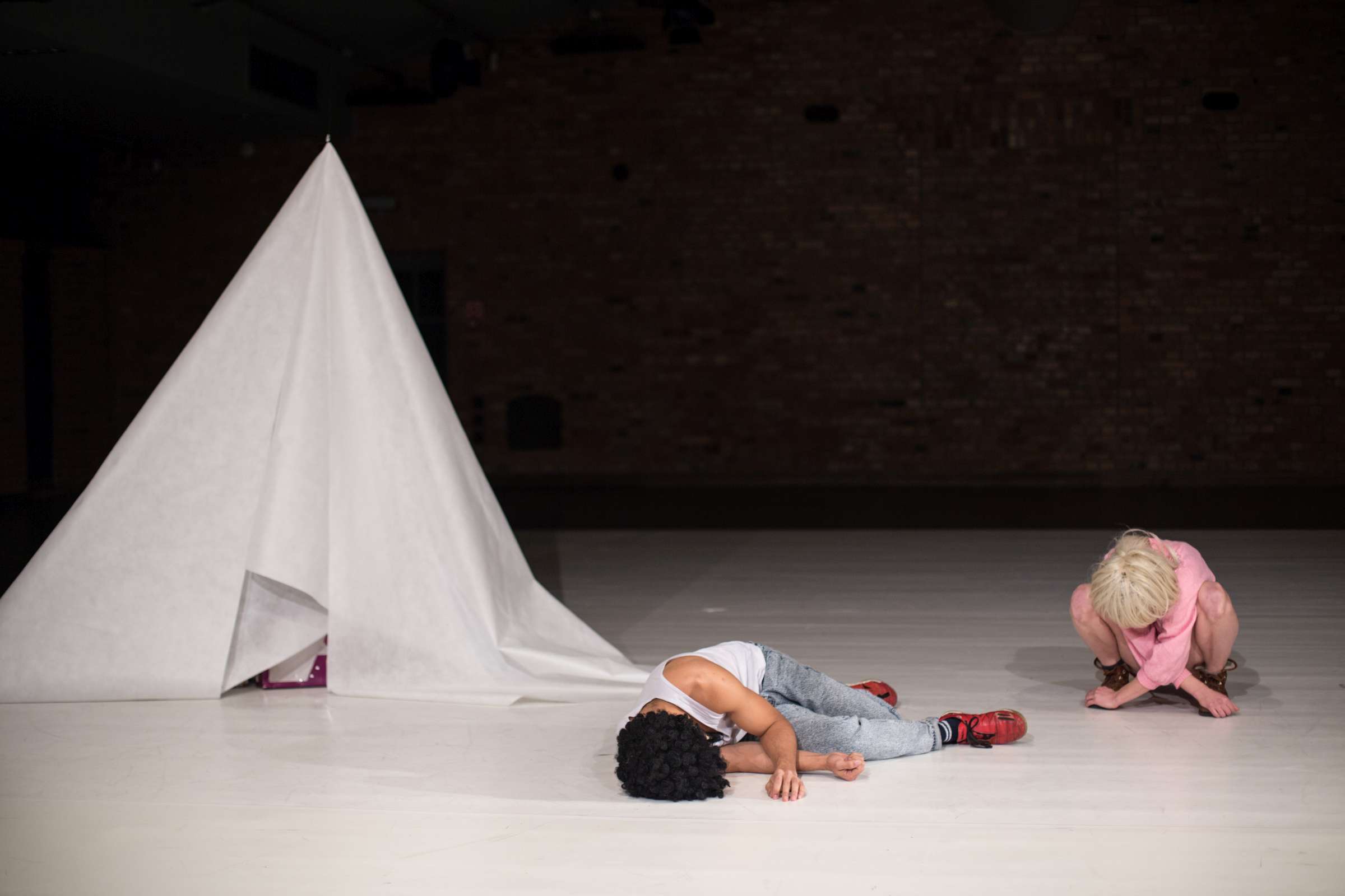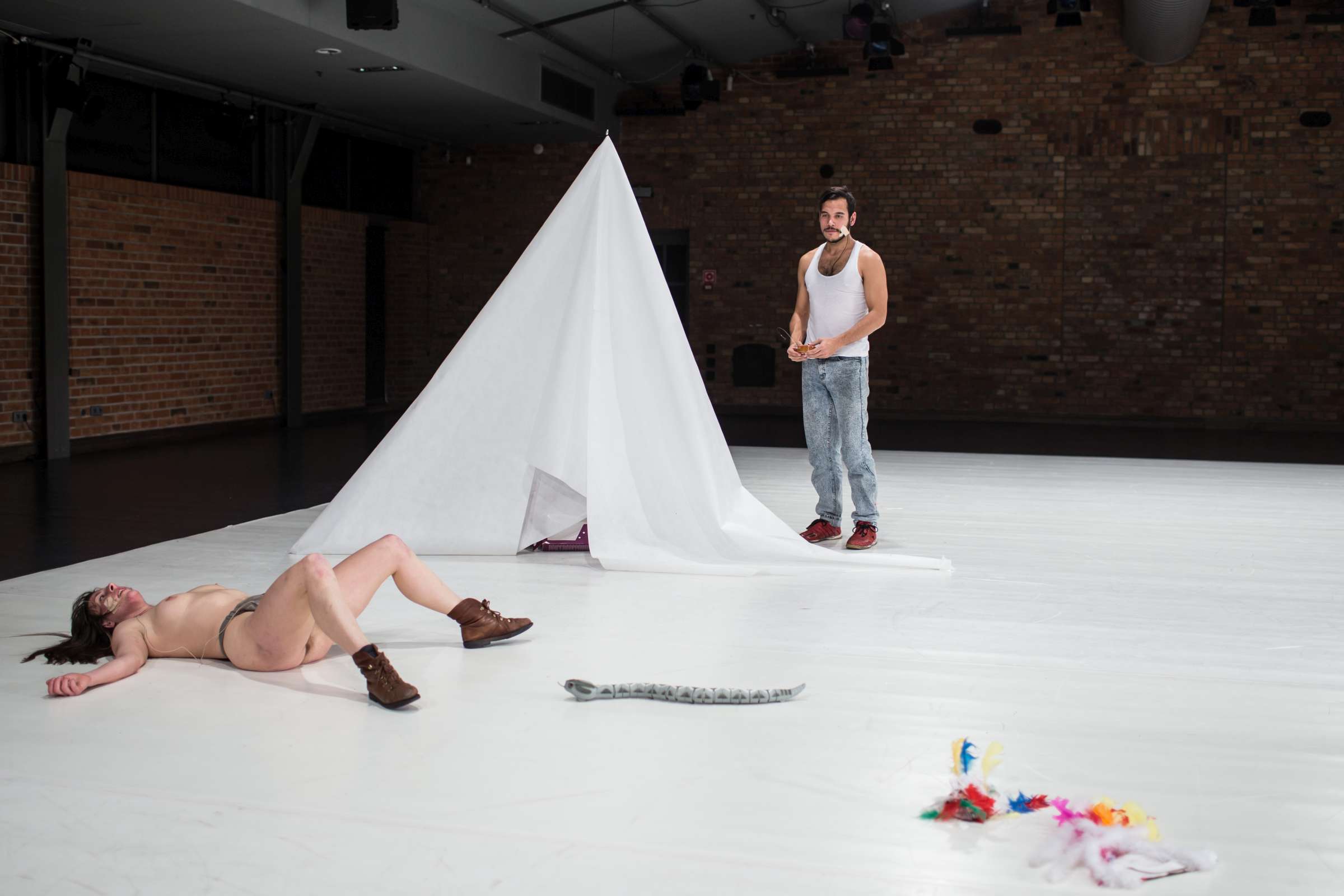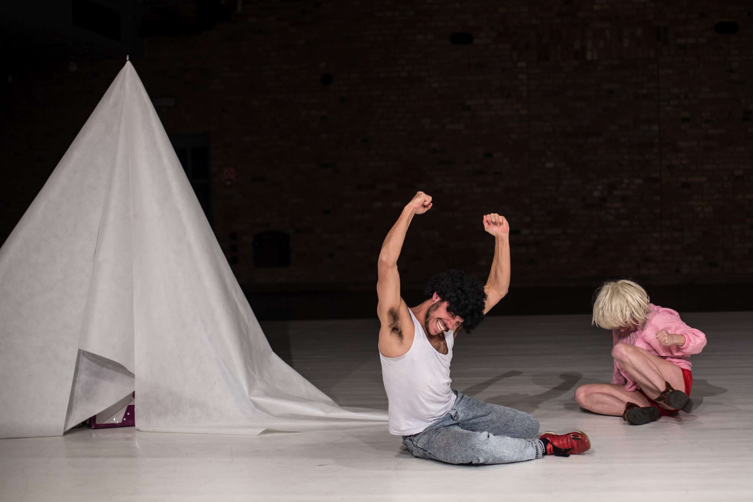 Golden Game is a collaboration of Claire Vivianne Sobottke and Tian Rotteveel on uncontrolled spaces of childhood and the body of desire. It is a catapult to childhood, to its raw emotional landscapes and the uncontrolled amplitudes emotions can have. Of the fact that children are being thrown into a world of emotions and communication without understanding them, and even to become their only means to express and connect to the concrete and abstract world. It’s a research dedicated to curiosity and playfulness, cancelling assumptions and learned behavior. It explores naïve embodiment as a detector of the symptoms in the world. It explores a body that is driven by raw desires and sensations, constantly pulled into various directions, a body not stable, but a becoming. Open the ability to enjoy transformation and having an inconsistent identity, a playable one.