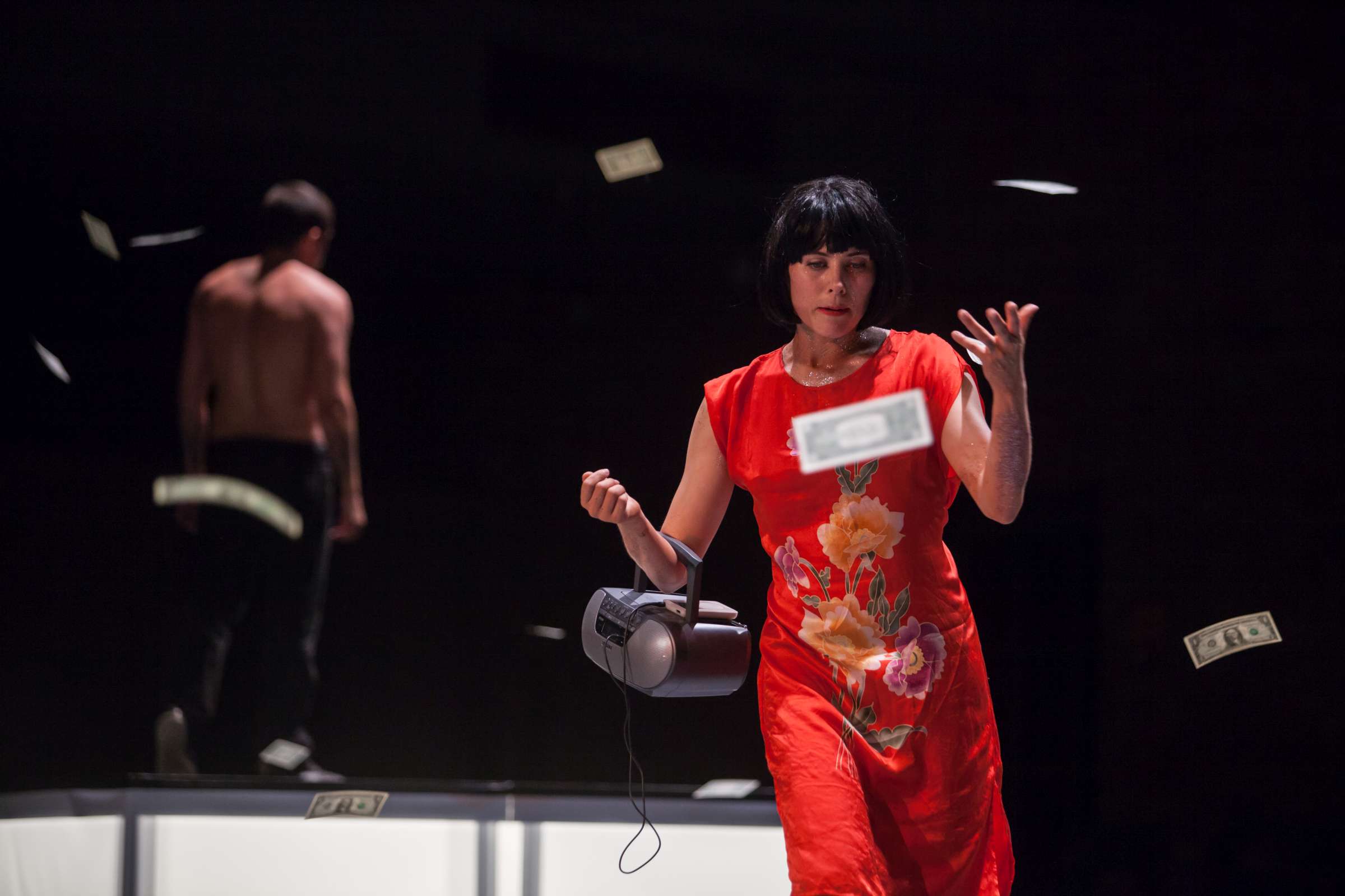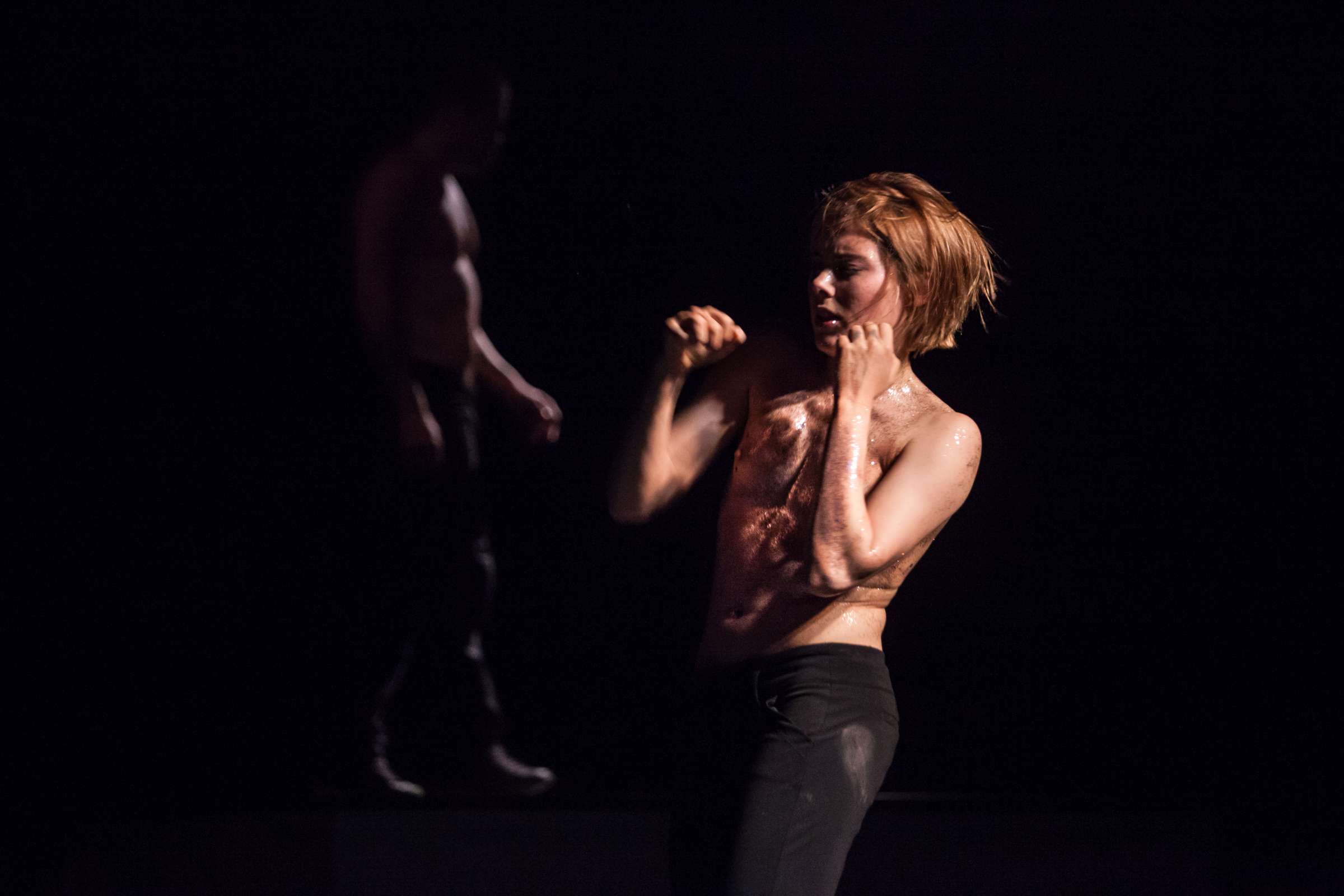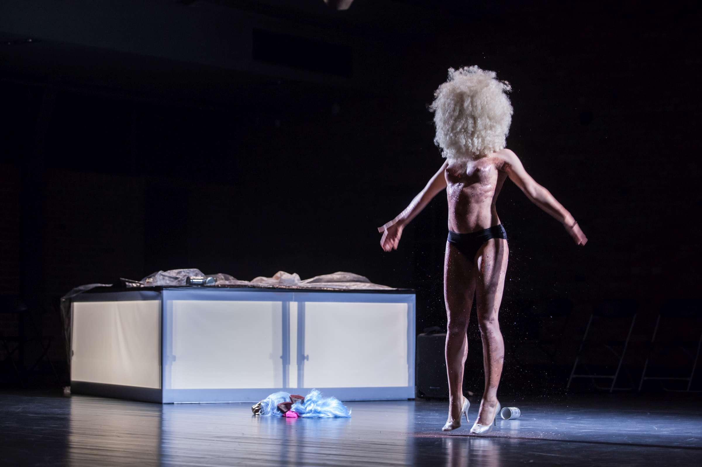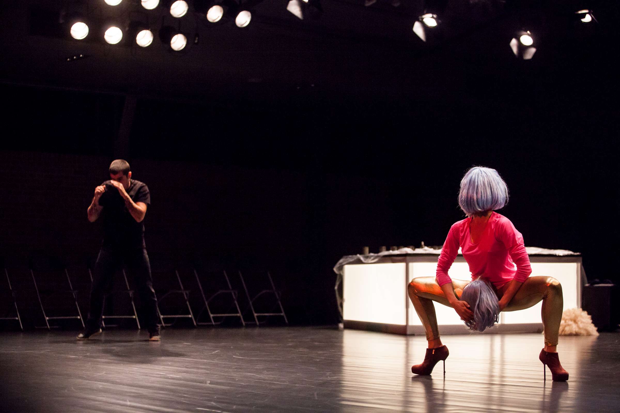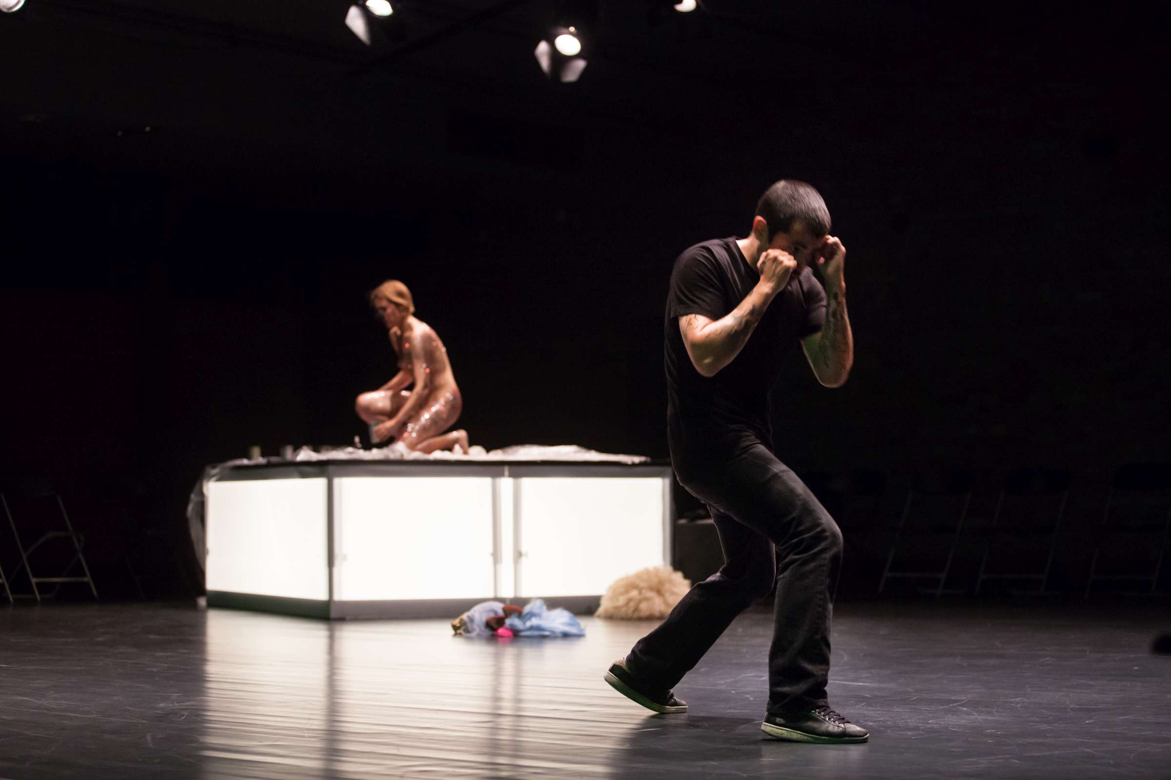 The title of the show may refer to an animal, a bat, however, may also be read as an abbreviation of: Bold Action Tool, Bad As That, blood-sucking BAT, Beautiful Anonymous Tragedy or Be Always There. The artist explores different forms of anonymity and the processes of camouflage and transformation. Balancing on high heels, “deprived” of face, she becomes a well lubricated body – insane, spinning and unbridled. A boxer enters a ring and starts a silent conversation with invisible limitations. In one corner, metronome precision of a sportsman getting ready for a fight; in the second, a victim undergoing a metamorphosis, getting blows which in fact never reach her. The boxer is the embodiment of intensity, effectiveness, concentration and strength, a counterpoint to the fragmentary and chaotic nature of the victim. The show is reminiscent of movement spreading like a lightning, energy which transforms into violence. In BAT, MCH questions various processes of camouflage, transformation and anonymity. On stage, a boxer acts as a counter-point to herself: he embodies intensity, efficiency, focus and power whereas she is fragmented and chaotic. BAT is a hard movement, our generation. A movement which spreads like a storm. An energy which turns into violence, that energy we find in life.