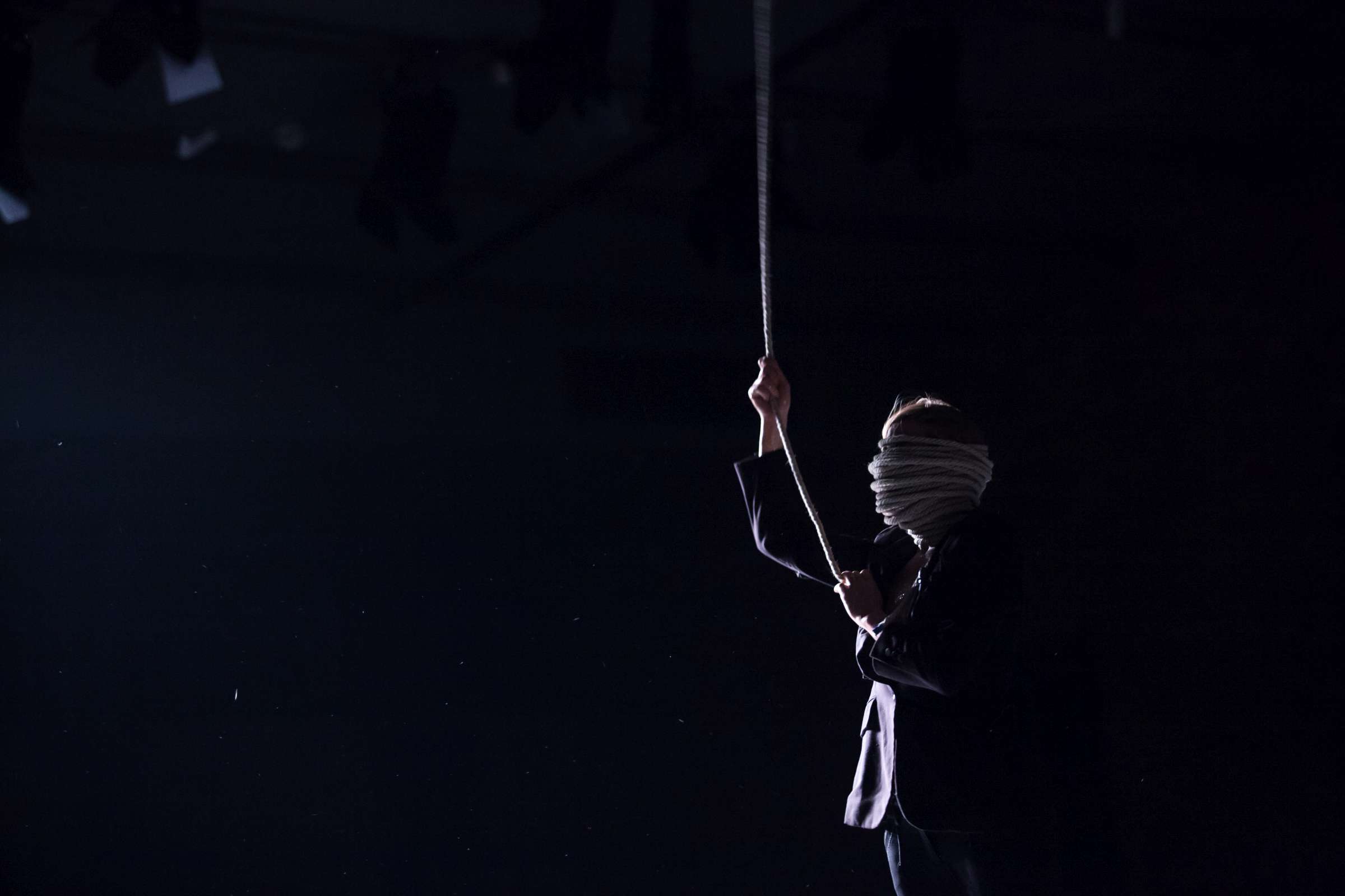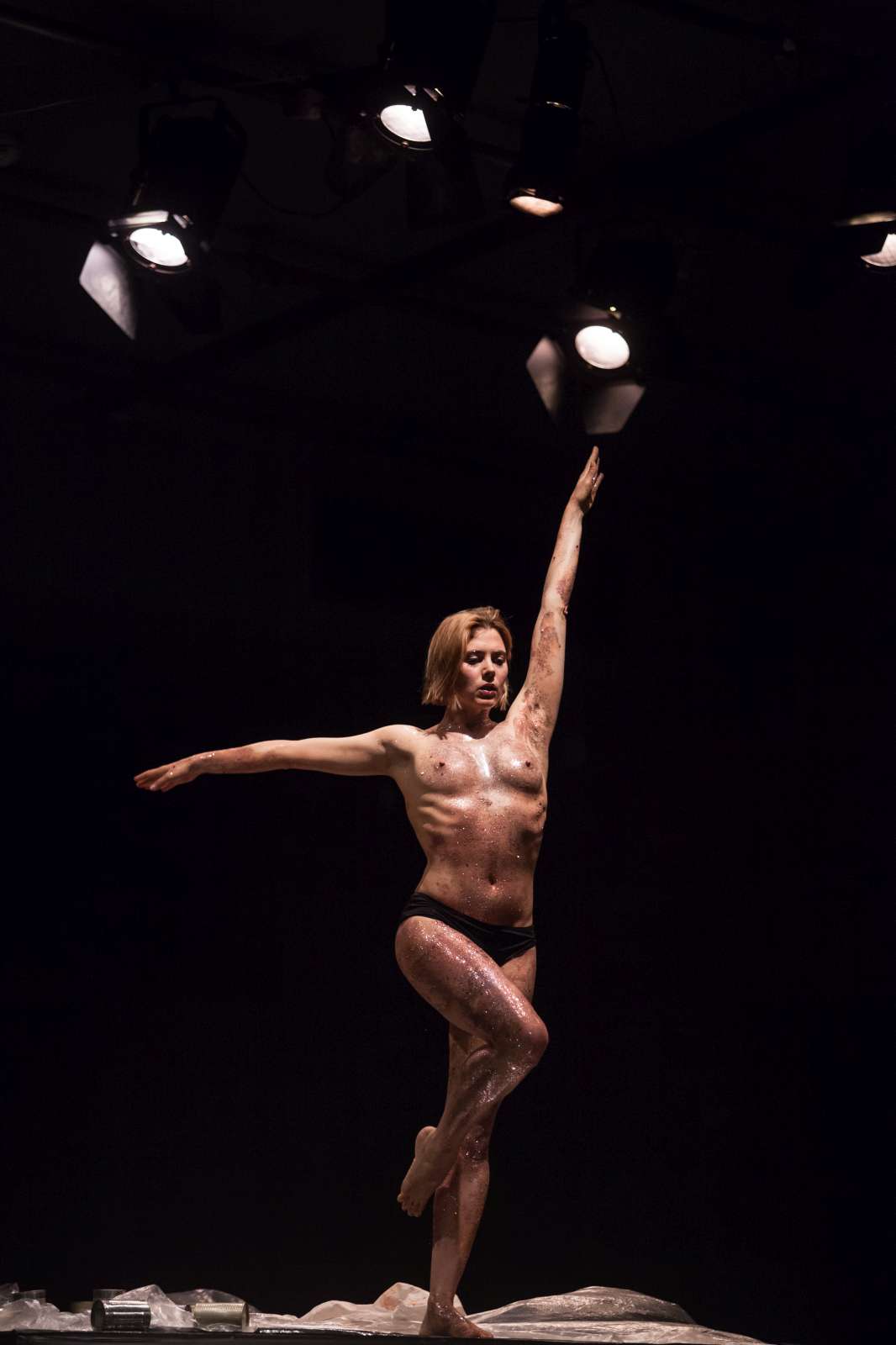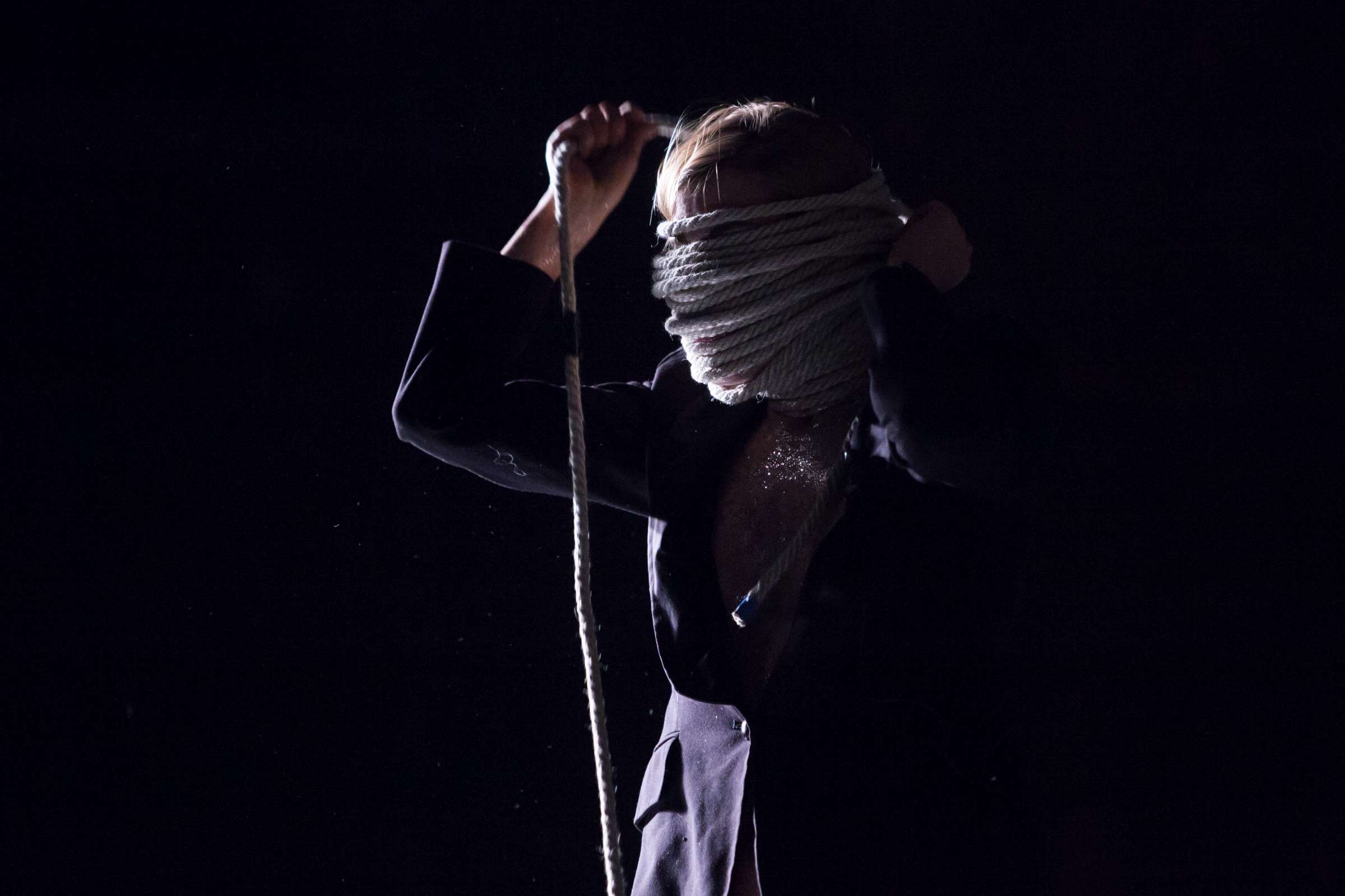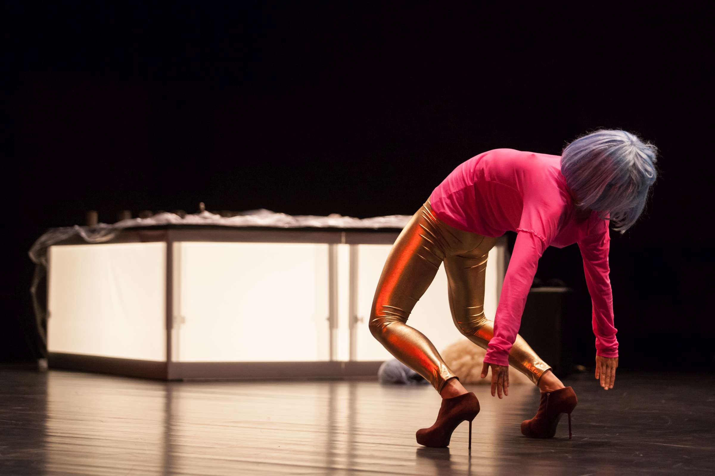 The title of the show may refer to an animal, a bat, however, may also be read as an abbreviation of: Bold Action Tool, Bad As That, blood-sucking BAT, Beautiful Anonymous Tragedy or Be Always There. The artist explores different forms of anonymity and the processes of camouflage and transformation. Balancing on high heels, “deprived” of face, she becomes a well lubricated body – insane, spinning and unbridled. A boxer enters a ring and starts a silent conversation with invisible limitations. In one corner, metronome precision of a sportsman getting ready for a fight; in the second, a victim undergoing a metamorphosis, getting blows which in fact never reach her. The boxer is the embodiment of intensity, effectiveness, concentration and strength, a counterpoint to the fragmentary and chaotic nature of the victim. The show is reminiscent of movement spreading like a lightning, energy which transforms into violence. In BAT, MCH questions various processes of camouflage, transformation and anonymity. On stage, a boxer acts as a counter-point to herself: he embodies intensity, efficiency, focus and power whereas she is fragmented and chaotic. BAT is a hard movement, our generation. A movement which spreads like a storm. An energy which turns into violence, that energy we find in life.