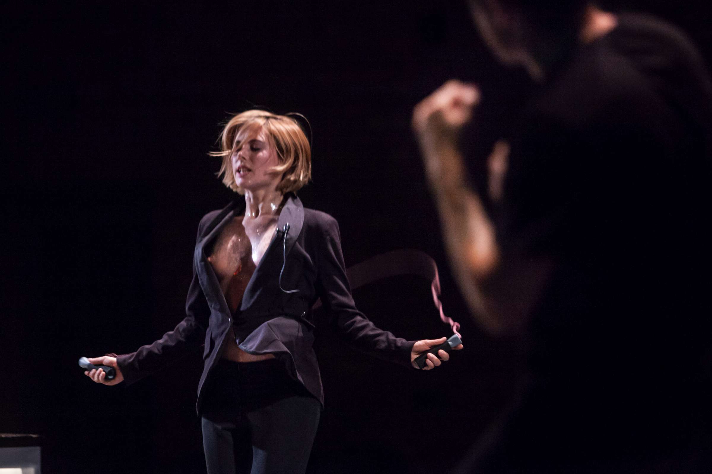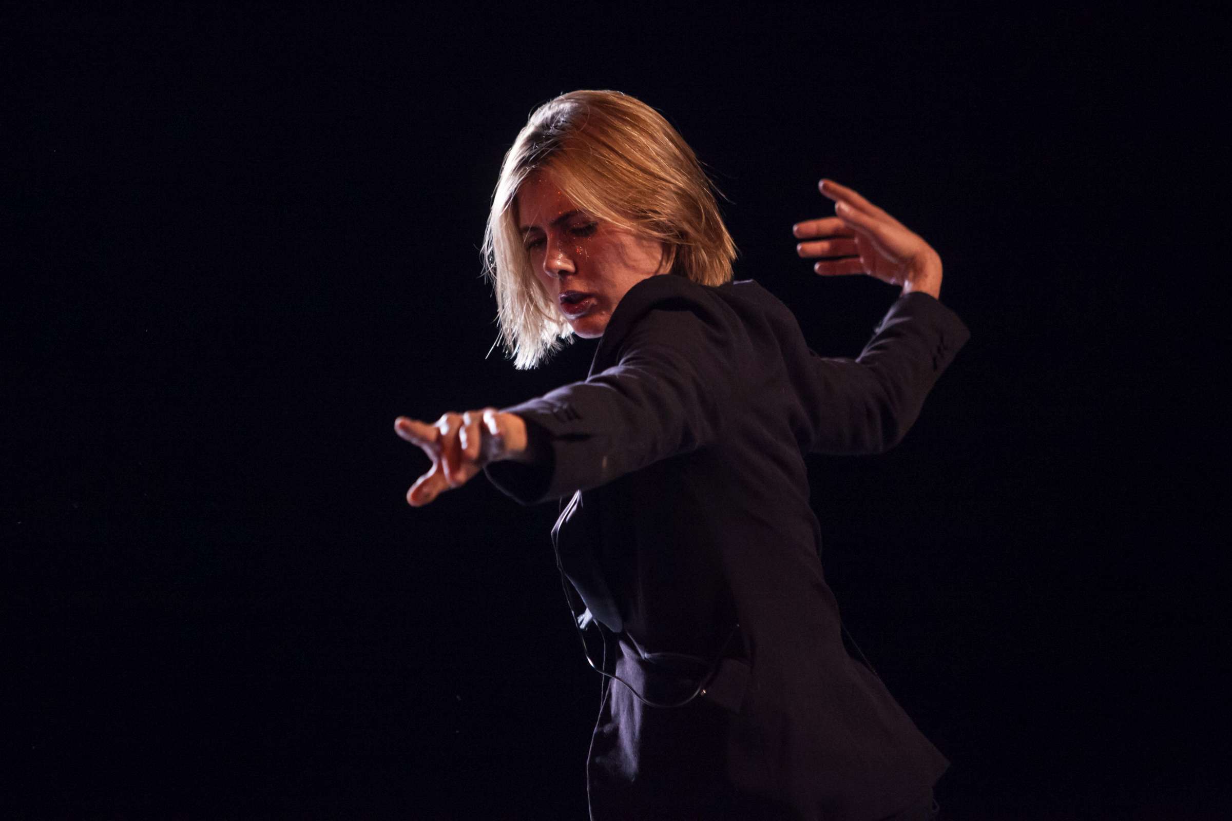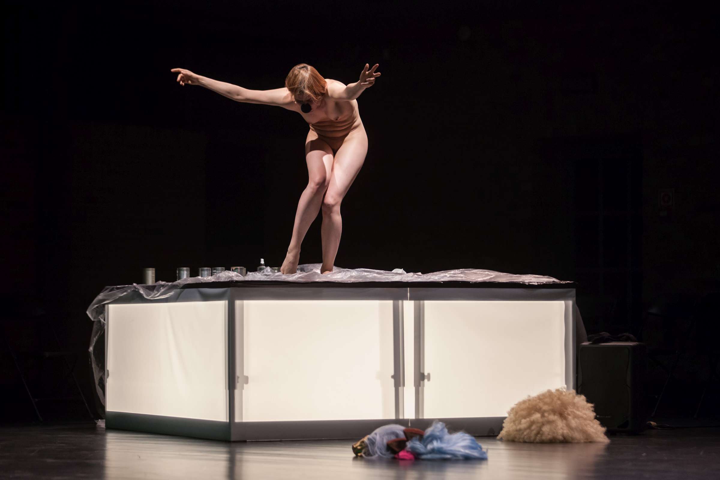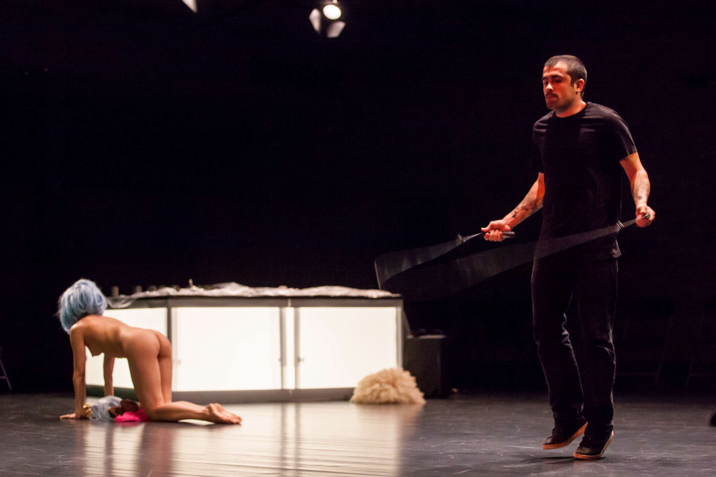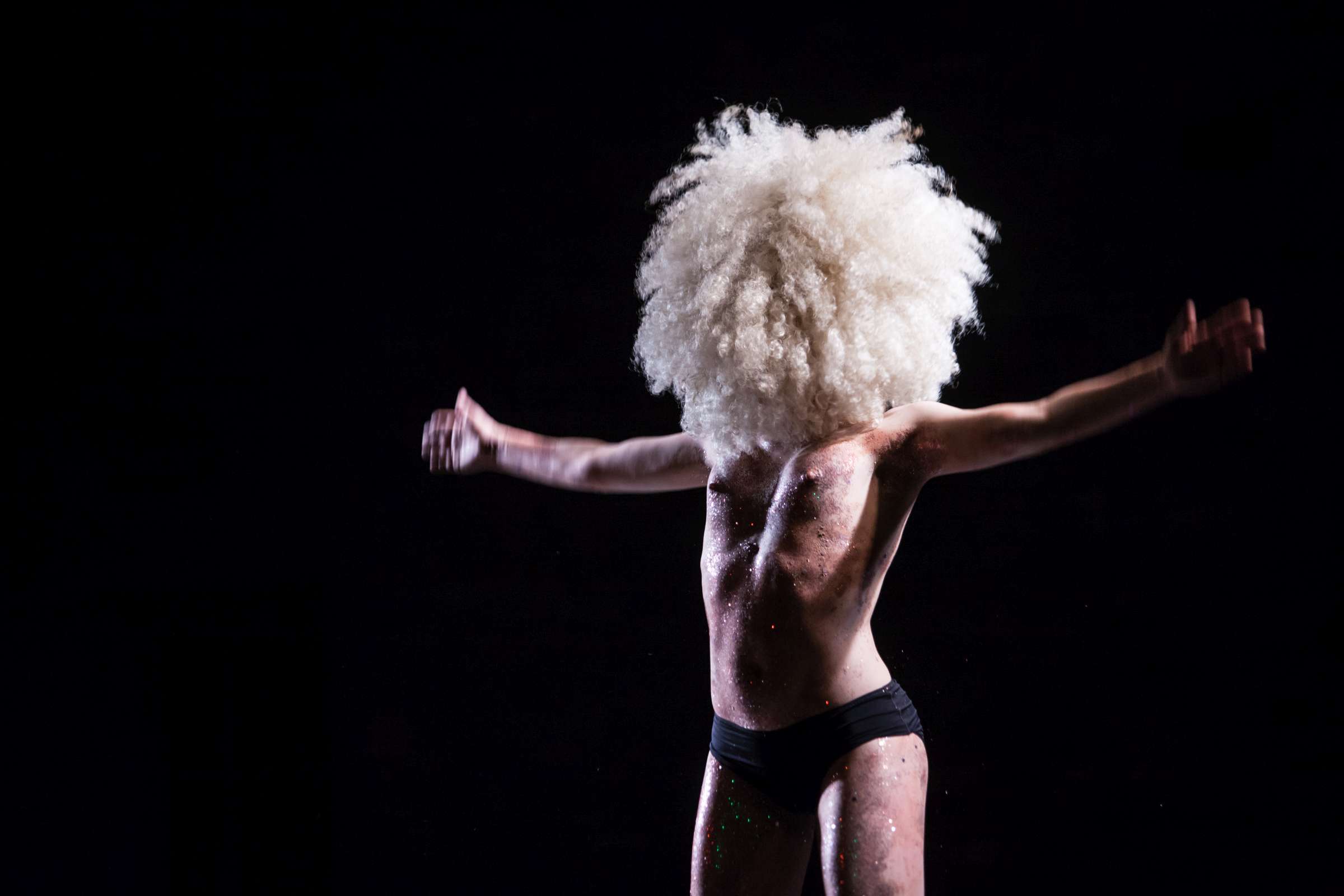 The title of the show may refer to an animal, a bat, however, may also be read as an abbreviation of: Bold Action Tool, Bad As That, blood-sucking BAT, Beautiful Anonymous Tragedy or Be Always There. The artist explores different forms of anonymity and the processes of camouflage and transformation. Balancing on high heels, “deprived” of face, she becomes a well lubricated body – insane, spinning and unbridled. A boxer enters a ring and starts a silent conversation with invisible limitations. In one corner, metronome precision of a sportsman getting ready for a fight; in the second, a victim undergoing a metamorphosis, getting blows which in fact never reach her. The boxer is the embodiment of intensity, effectiveness, concentration and strength, a counterpoint to the fragmentary and chaotic nature of the victim. The show is reminiscent of movement spreading like a lightning, energy which transforms into violence. In BAT, MCH questions various processes of camouflage, transformation and anonymity. On stage, a boxer acts as a counter-point to herself: he embodies intensity, efficiency, focus and power whereas she is fragmented and chaotic. BAT is a hard movement, our generation. A movement which spreads like a storm. An energy which turns into violence, that energy we find in life.