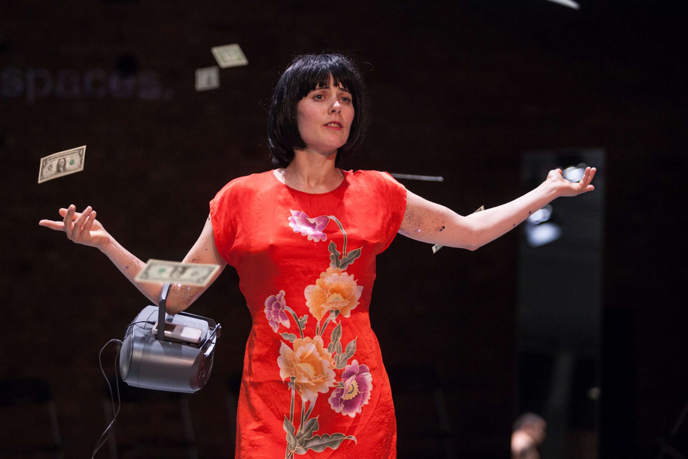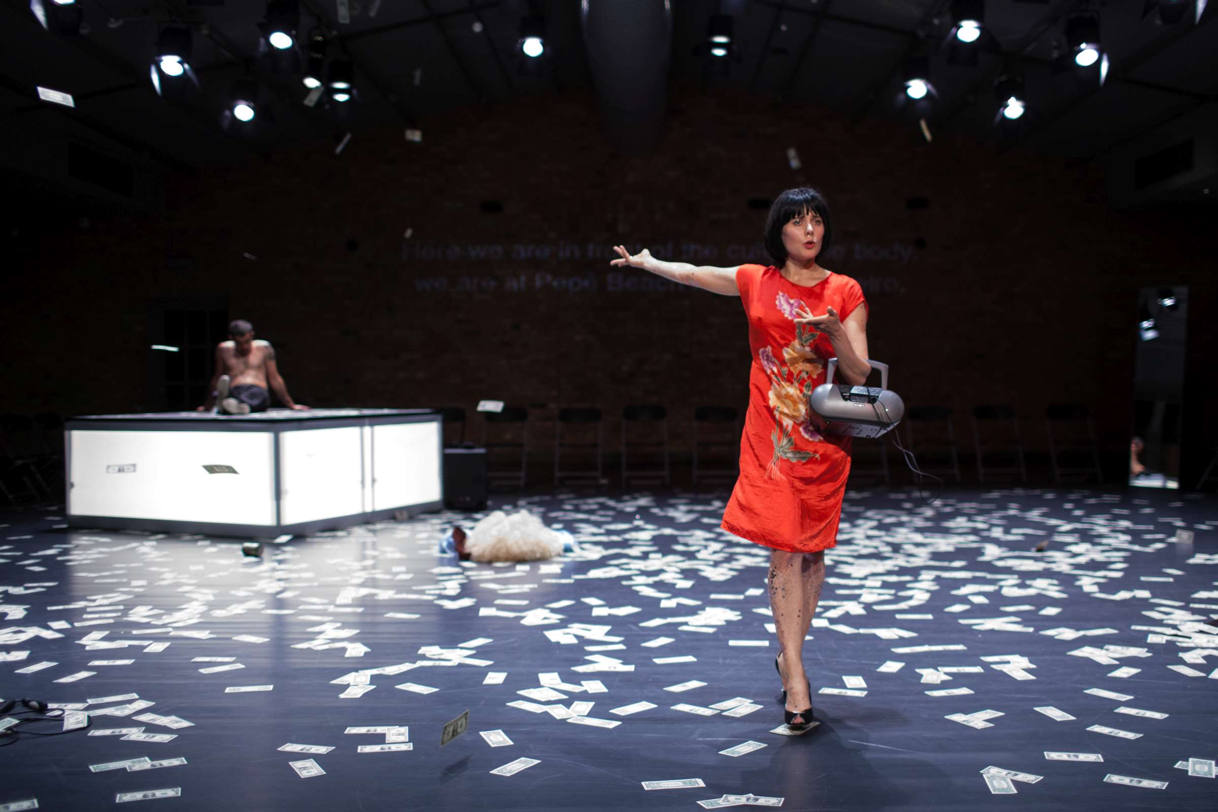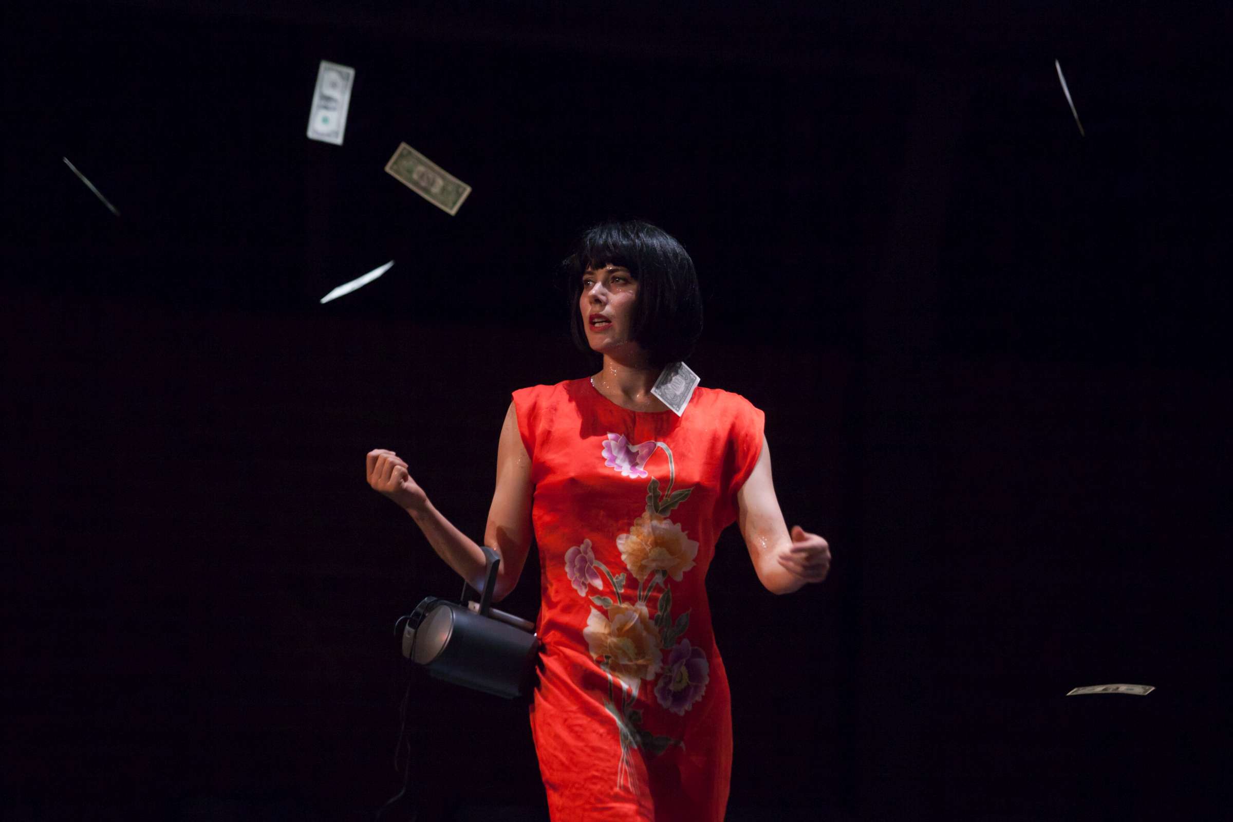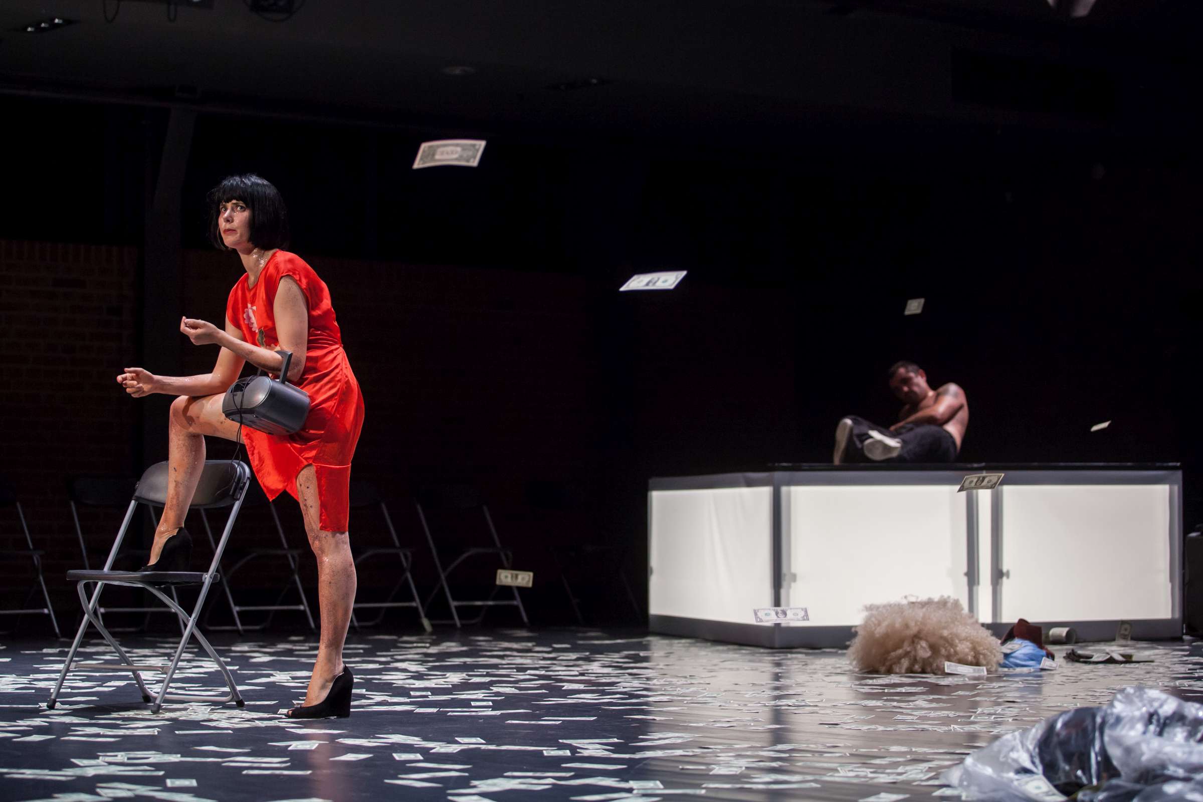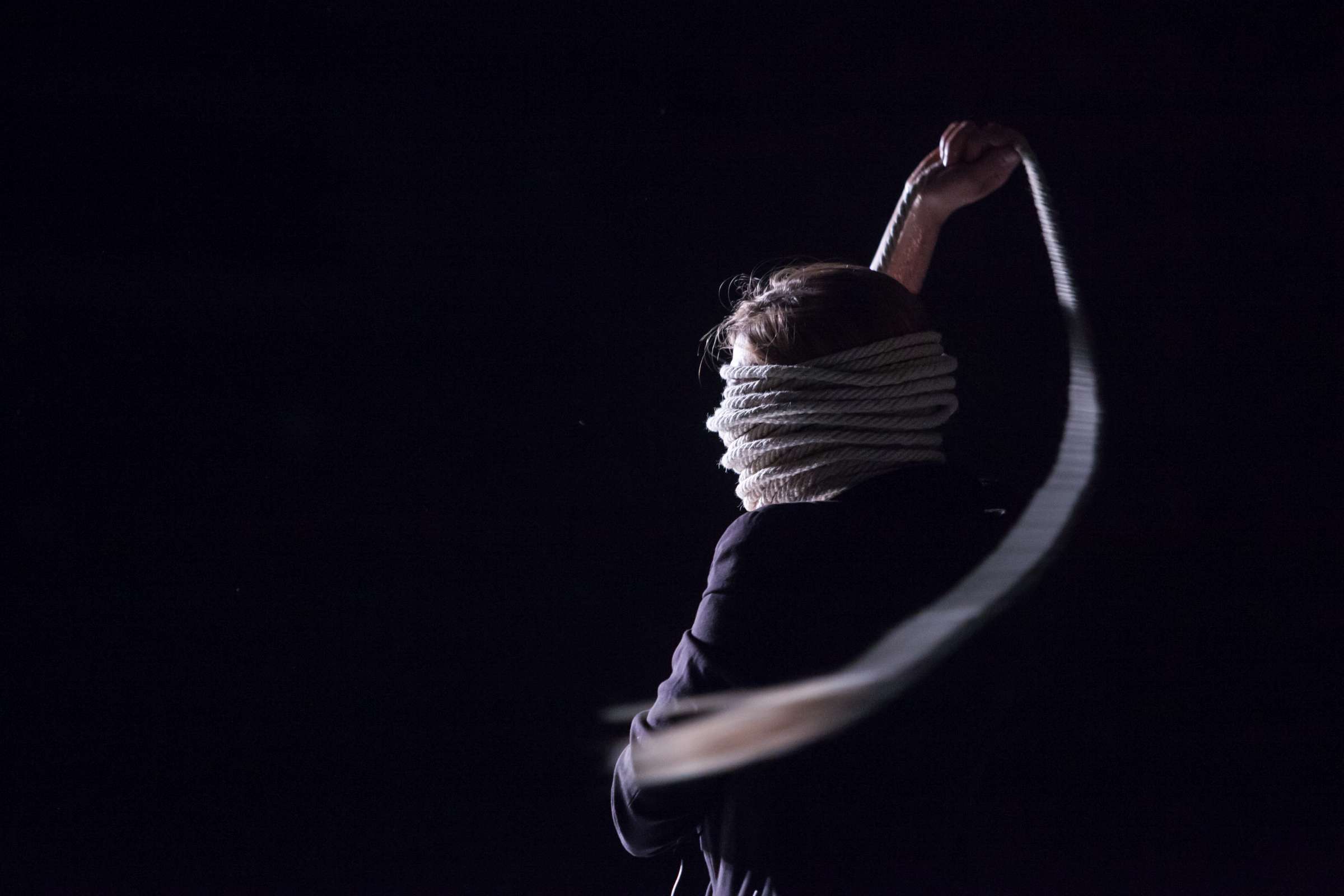 The title of the show may refer to an animal, a bat, however, may also be read as an abbreviation of: Bold Action Tool, Bad As That, blood-sucking BAT, Beautiful Anonymous Tragedy or Be Always There. The artist explores different forms of anonymity and the processes of camouflage and transformation. Balancing on high heels, “deprived” of face, she becomes a well lubricated body – insane, spinning and unbridled. A boxer enters a ring and starts a silent conversation with invisible limitations. In one corner, metronome precision of a sportsman getting ready for a fight; in the second, a victim undergoing a metamorphosis, getting blows which in fact never reach her. The boxer is the embodiment of intensity, effectiveness, concentration and strength, a counterpoint to the fragmentary and chaotic nature of the victim. The show is reminiscent of movement spreading like a lightning, energy which transforms into violence. In BAT, MCH questions various processes of camouflage, transformation and anonymity. On stage, a boxer acts as a counter-point to herself: he embodies intensity, efficiency, focus and power whereas she is fragmented and chaotic. BAT is a hard movement, our generation. A movement which spreads like a storm. An energy which turns into violence, that energy we find in life.