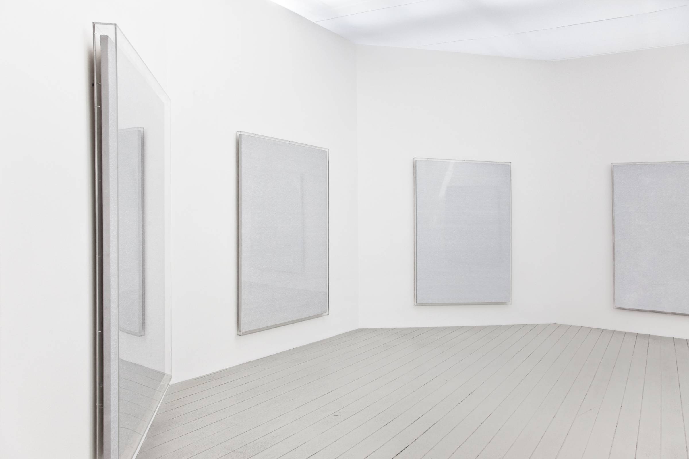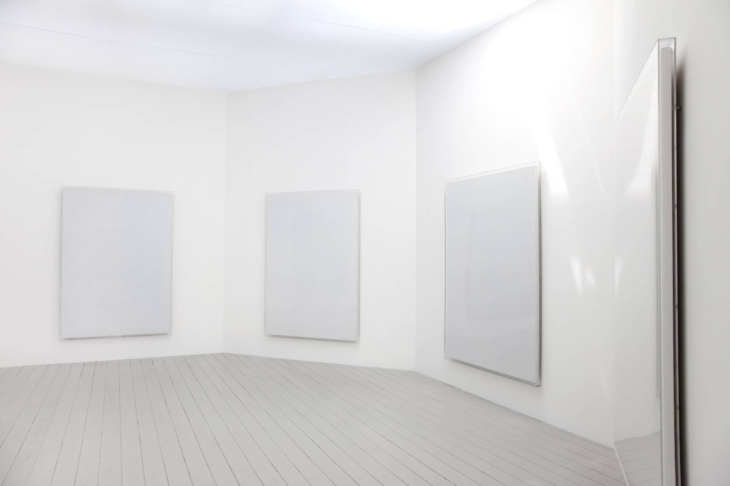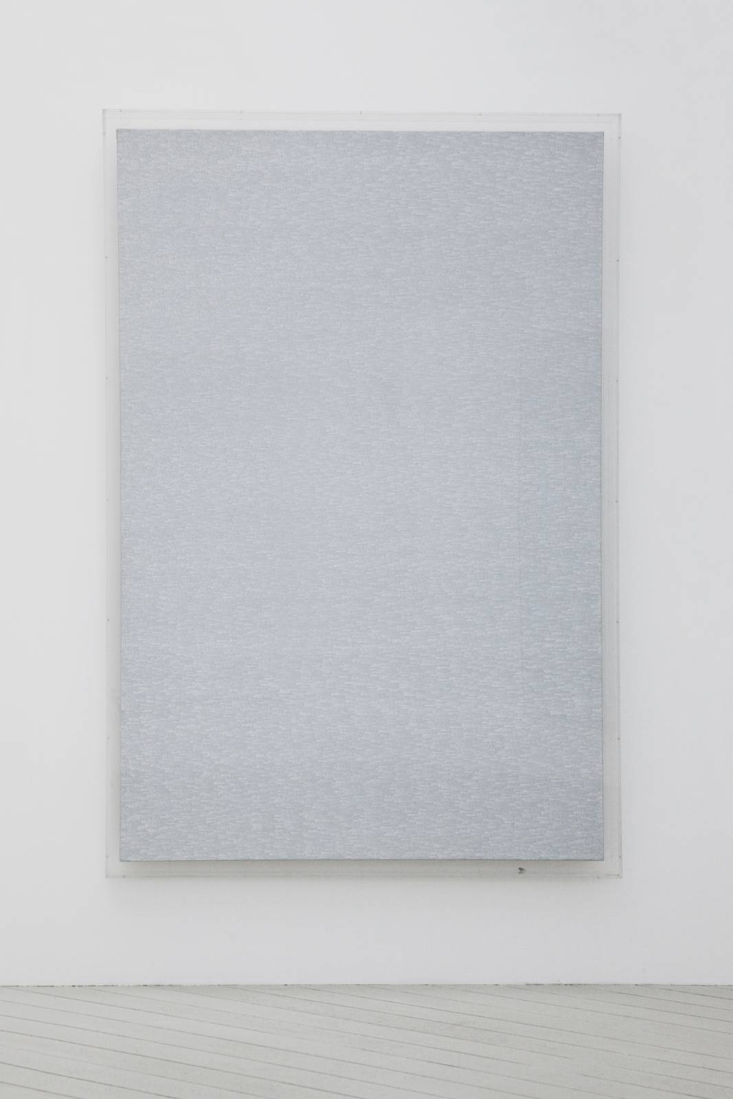 The artist began the series by covering a black background with rows of white numbers. He then continued the series on a gray background which gradually, as of 1972, has been made lighter in parallel with the increasing whitening of the rows of numbers. The process of an incremental increase of series of numbers that gradually disappear into the white background be- cause of an absence of contrast, is also recorded by the artist’s voice. The audio element is, then, not only part and parcel of the work which it documents, but is likewise a major structural component as it adds to the metaphysical dimension of the whole. Sequences of numbers that the artist has uttered throughout decades, set free from the frame of the painting, are further proof of the passage of time. In addition, as the rows of numbers are becoming ever whiter, the recordings seem in fact the sole proof of their existence in the recently finished paintings.